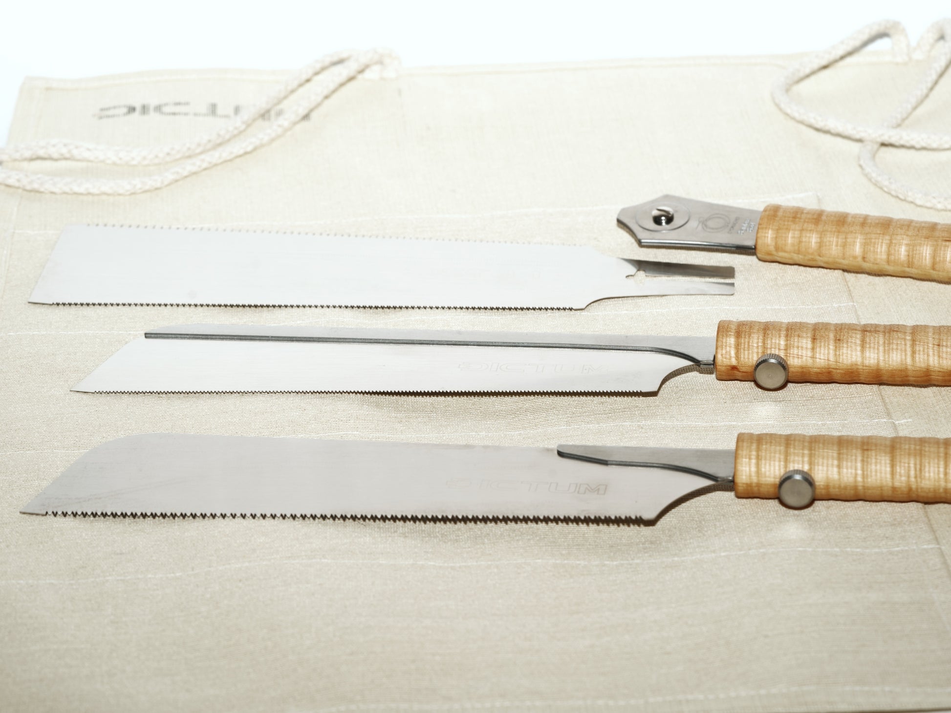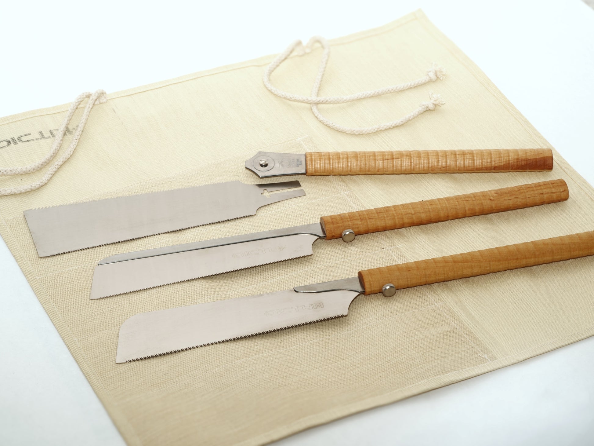 Šis japāņu zāģu komplekts ir augstas kvalitātes risinājums precīziem galdniecības un amatniecības darbiem, apvienojot trīs profesionālus japāņu zāģus un ērtu, sarullējamu, džutas auduma instrumentu maciņu uzglabāšanai un transportēšanai. Japāņu zāģi griež vilkšanas virzienā, kas nodrošina labāku kontroli, mazāku piepūli un īpaši tīru griezumu.